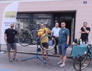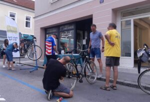 Das RadReparaturCafé findet mit Unterstützung der KEM Reparaturinitative der Stadt Wiener Neustadt statt und diese hat sich dankenswerterweise auch um die Parkplatzabsperrung vor dem Radgeschäft gekümmert. Daher konnte an diesem warmen Sommerabend auch draußen in aller Ruhe gemeinsam getüftelt und geschraubt werden. Gemeinsam mit unseren ehrenamtlichen Amateurschraubern und dem Profi Martin Dočkal von vielrad wurden so viele Räder wie noch nie repariert.