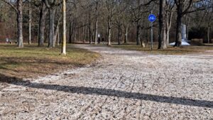 Durch den Akademiepark führen 2 offizielle Radwege bzw. -Routen. Sie sind wichtige und landschaftlich auch schöne Ersatzstrecken für die stark befahrenen Grazer und Günser Straße sowie Ungargasse. Auch scheinen sie in allen Radverkehrskonzepten auf. Doch Schotter (Bild rechts) und im Winter Eis und Schnee mindern ihre Alltagstauglichkeit. Das Problem dabei: Der Park gehört der BIG, also dem Bund und nicht der Stadt.