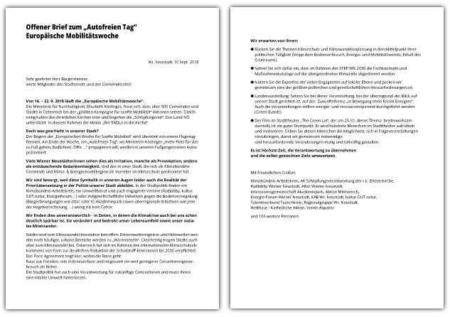 Dass umweltbewußte Menschen empört sind, ist verständlich. Die Radlobby schrieb daher zusammen mit anderen Organisationen und Personen einen offenen Brief an den Bürgermeister und an den Gemeinderat der Stadt. 106 Personen und 12 Organisationen haben sich angeschlossen. Wir haben den Brief am 17. September vor der Gemeinderatssitzung persönlich an die Gemeinderäte übergeben.