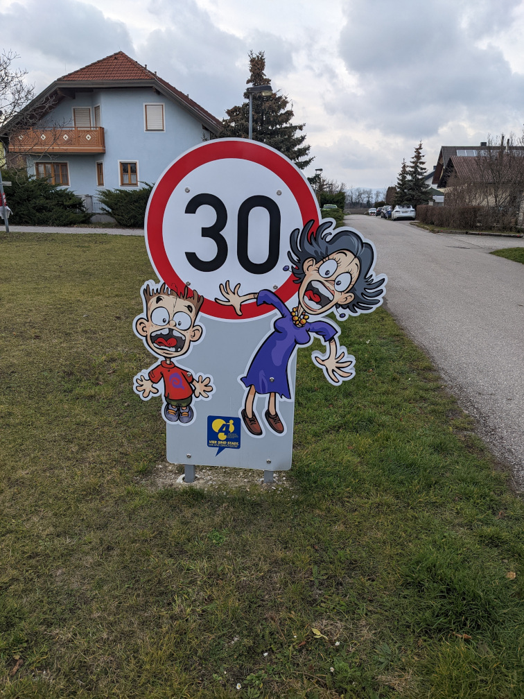 Ein weiteres Beispiel, das nicht direkt mit dem Radverkehr zu tun hat, aber indirekt mit der Sicherheit des Radverkehrs, war die Einführung der 30er Zonen. Hier ist meiner Meinung nach die Idee der “lustigen” Schilder nach hinten losgegangen. Diese sehen viel mehr aus, als würden sich die abgebildeten Figuren vor dem 30er fürchten. Dies würde zumindest der autofreundlichen Haltung der Ebreichsdorfer Stadtregierung entsprechen.
