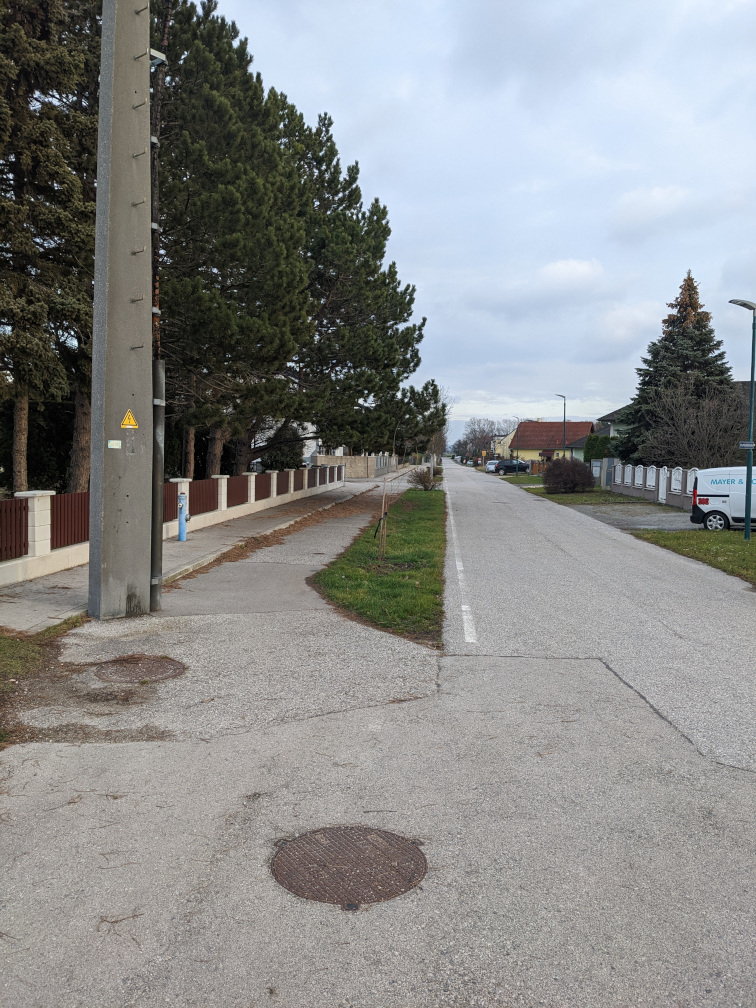 Da ich in der Drasche-Siedlung in Ebreichsdorf wohne, sind die nähesten Einkaufsmöglichkeiten der Penny und der Bipa. Wie auf dem Bild aus dem Kartenmaterial der Basemap zu sehen ist, befindet sich der Radweg (braune Belag entlang des Gehweges) genau auf der gegenüberliegenden Seite. Wer dort einkaufen will, muss die Straße ohne einer Überquerungshilfe überwinden. Es gibt auch einige Radfahrende, denen dies zu riskant ist und widerrechtlich den Gehweg auf der anderen Seite mit dem Fahrrad befahren, da dies für sie viel sicherer erscheint.