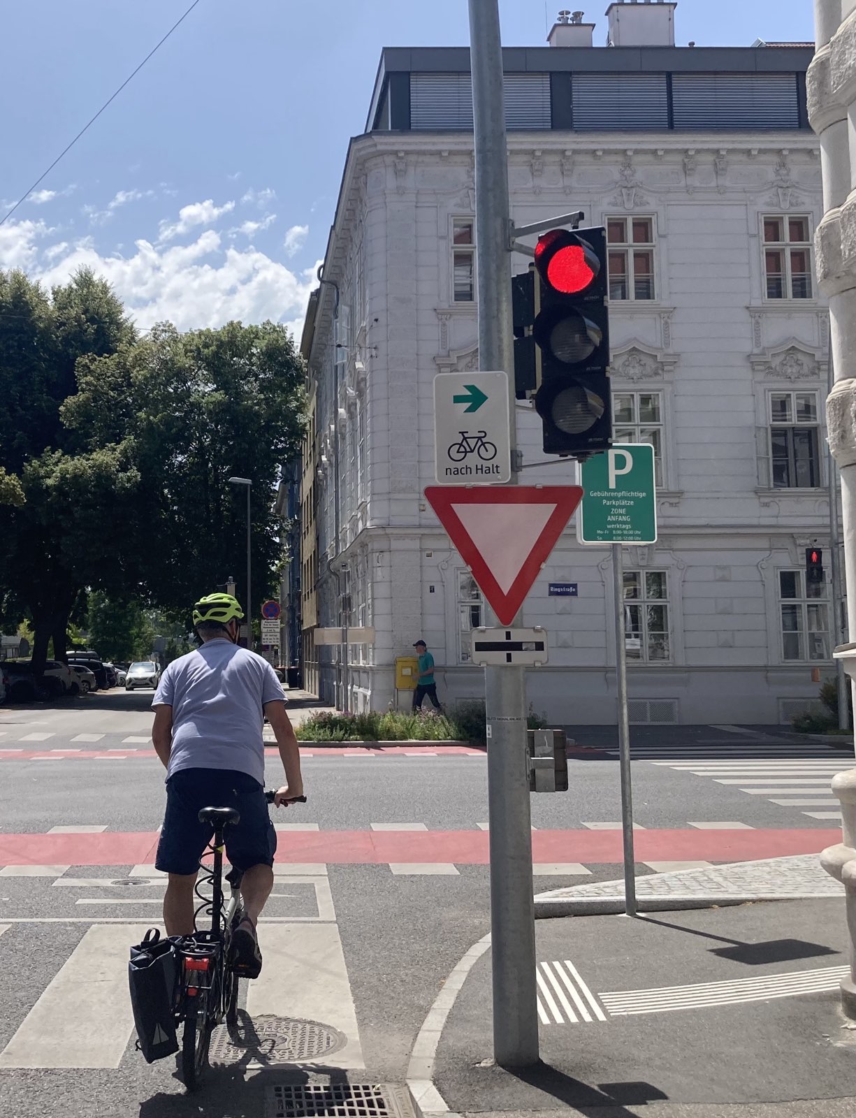Seit der 33. Novelle der Straßenverkehrsordnung (StVO), die am 1. Oktober 2022 in Kraft trat, können Bezirkshauptmannschaften und Magistrate Radfahrenden an einzelnen Kreuzungen das Rechtsabbiegen bei Rot erlauben. Sie können per Verordnung ein Zusatzschild mit grünem Pfeil anbringen lassen. An T-Kreuzungen können sie mit solchen Schildern auch das Geradeausfahren bei Rot ermöglichen. Damit ist endlich auch in Österreich erlaubt, was in Ländern wie Frankreich, Belgien, den Niederlanden, Dänemark und der Schweiz schon länger gang und gäbe ist.