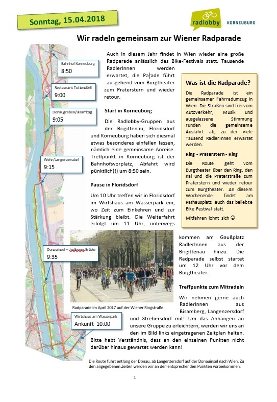 annter Atmosphäre auf freien Straßen gemeinsam, teils mit musikalischer Begleitung geradelt wird. Von Korneuburg aus gibt es heuer eine gemeinsame Anfahrt zur Radparade, unterwegs gibt es mehrere Treffpunkte für Radlerinnen aus Bisamberg, Langenzersdorf und Strebersdorf. Ab Floridsdorf werden wir zudem von der Polizei begleitet.