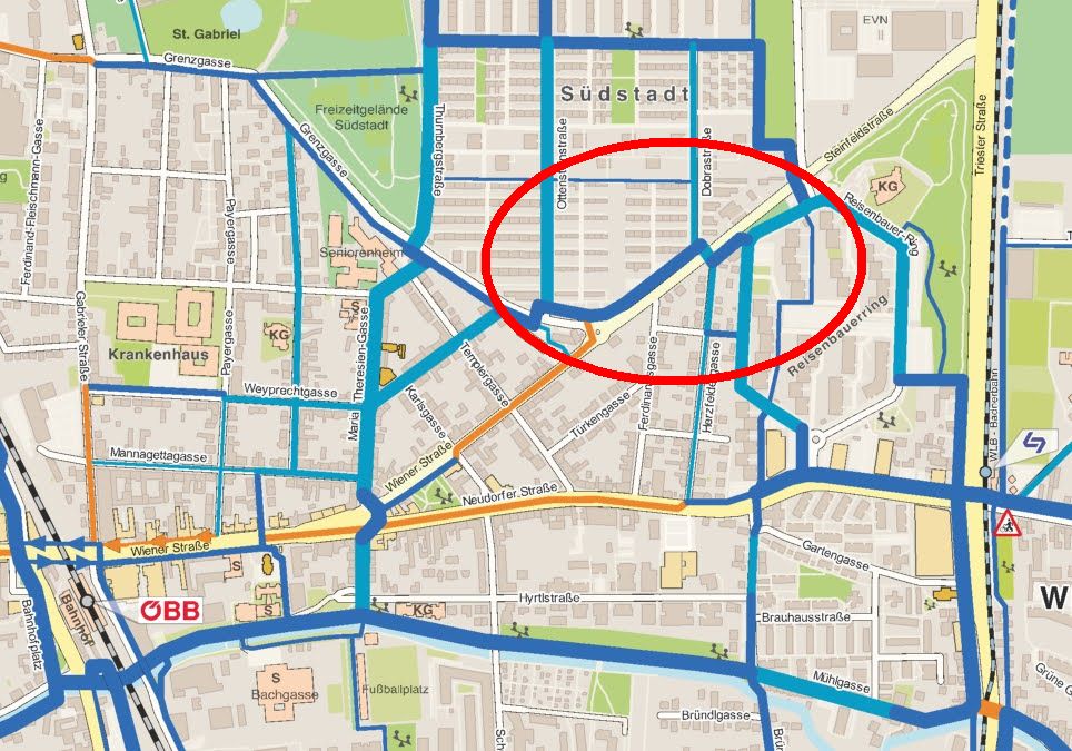 Der neue Radweg verbindet Wiener Neudorf (Reisenbauerring) mit Maria Enzersdorf (Südstadt) und Mödling und stellt eine wichtige Verbindung zwischen diesen Gemeinden dar. Der Radweg ist als gemischter Geh- und Radweg angelegt und ist durchgehend breit genug. Besonders positiv hervorzuheben ist die neue sichere Querung der Grenzgasse neben der Ottensteinstraße mit kombiniertem Schutzweg und Radfahrerüberfahrt.