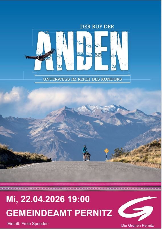 Am Mittwoch, 22.4.2026, findet um 19 Uhr der spannende Radreisevortrag “Der Ruf der Anden” im Gemeindeamt von Pernitz Gentzschgasse 1, 2763 Pernitz statt.