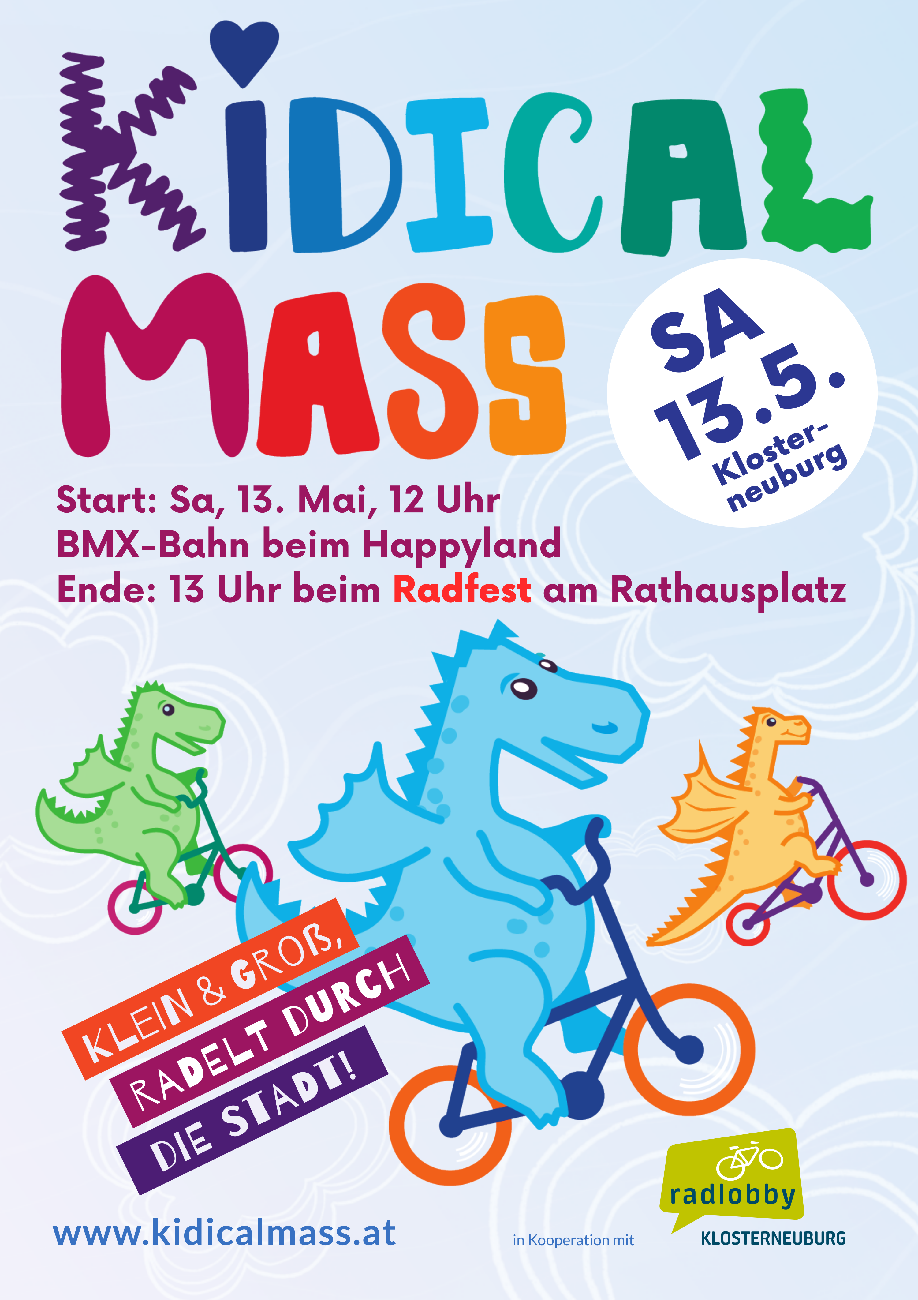 Wie schon in den vergangenen Jahren setzen wir ein Zeichen für aktive Mobilität im Straßenverkehr und radeln gemeinsam durch Klosterneuburg. Dieses Mal als „Kidical Mass“, also besonders kinderfreundlich mit verkürzter Strecke und reduziertem Tempo. Treffpunkt Samstag, 12 Uhr, BMX-Bahn beim Happyland. Ziel am Rathausplatz. Alle Details hier.