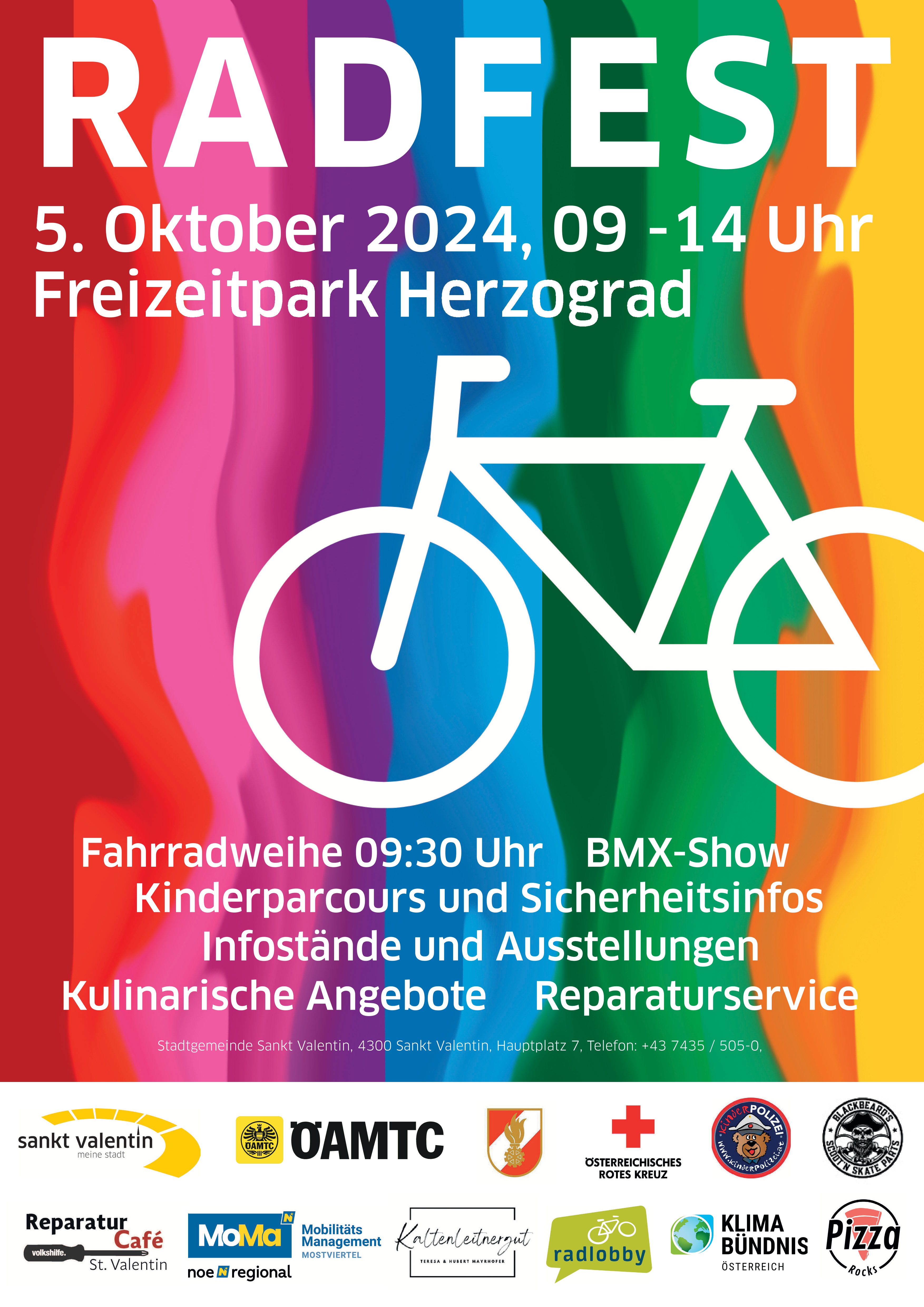 Die Gemeinde St. Valentin veranstaltet ein Radfest, inklusive Fahrradweihe, Kinderpacours und Reparaturservice. Für leibliches Wohl ist selbstverständlich gesortgt. Die Radlobby Enns-Donauwinkel ist mit einem Infostand dabei.