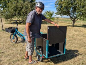 Für noch größere Lastentransporte hat er einen Radanhänger selbst konstruiert und gebaut. Praktisch ist die herausnehmbare Rückwand.