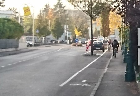 Die Radfahrenden am stadteinwärts führenden Radfahrstreifen sind zwischen Gehweg und parkenden oder einparkenden Fahrzeugen eingezwängt. Auch dieser Radfahrstreifen entspricht in der Breite nicht den RVS und, wenn ein Beifahrer die Tür öffnet, führt eine vielleicht noch rechtzeitige Ausweichbewegung auf die Gehsteigkante – und damit erst recht zum Sturz.
