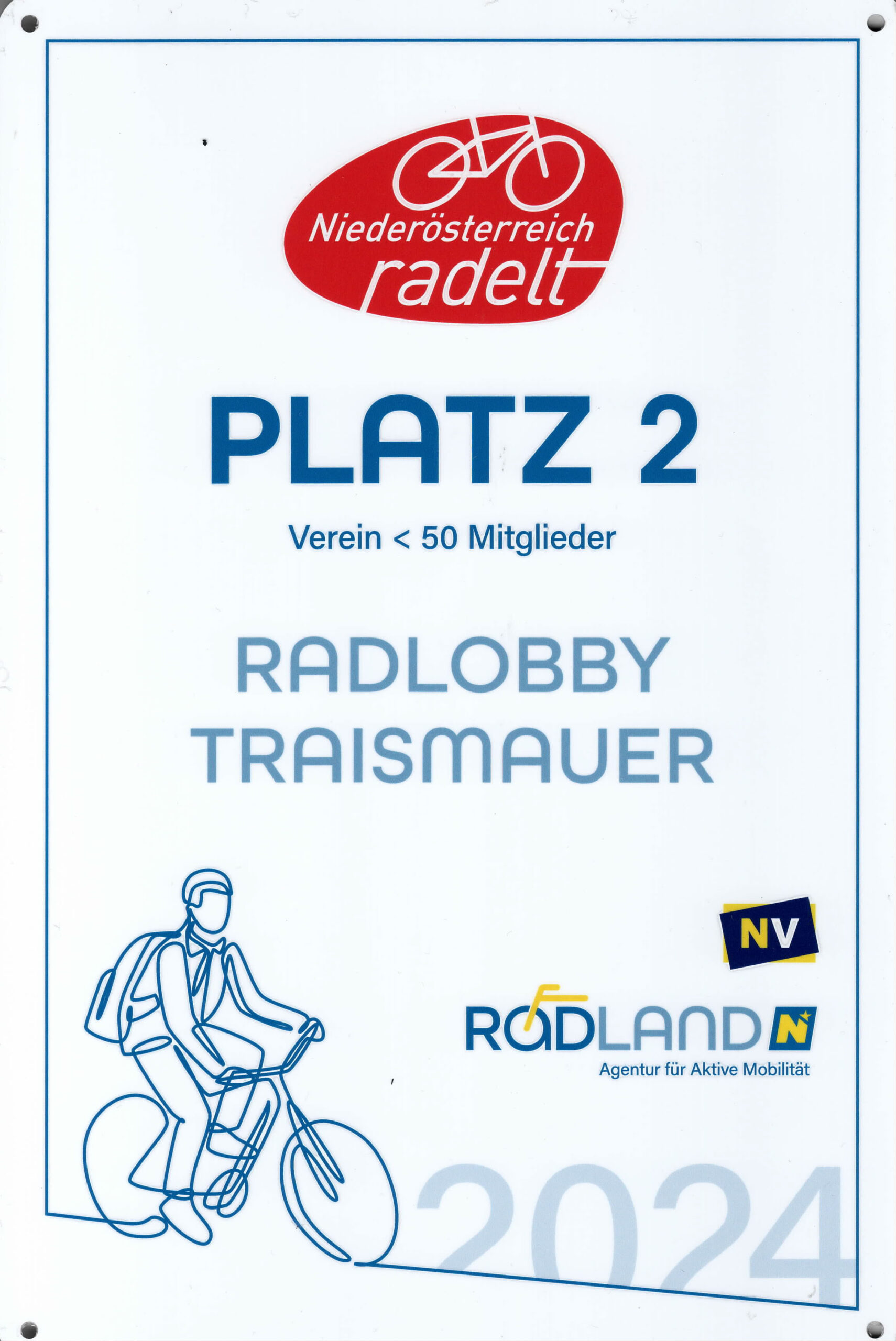 Beim Wettbewerb „Niederösterreich radelt“ landete die Radlobby Traismauer auf dem 2. Platz in der Kategorie Vereine unter 50 Mitglieder. Der Dank für die gute Platzierung gebührt unseren 12 Teilnehmern, die von 20. März bis 30. September 2024 in Summe 28.138 km zurücklegten. Hauptgrund für die gute Platzierung war nicht alleine die gefahrene Strecke, sondern der Verdienst, dass der kleine Verein so viele Radfahrer motivieren konnte. Die Preisübergabe fand am 6. November 2024 in St. Pölten statt. An der Kilometer-Sammel-Aktion “Niederösterreich radelt” haben insgesamt 340 Gemeinden, Betriebe, Vereine und Regionen teilgenommen. Näheres: https://niederoesterreich.radelt.at/aktuelles/landessieger-2024