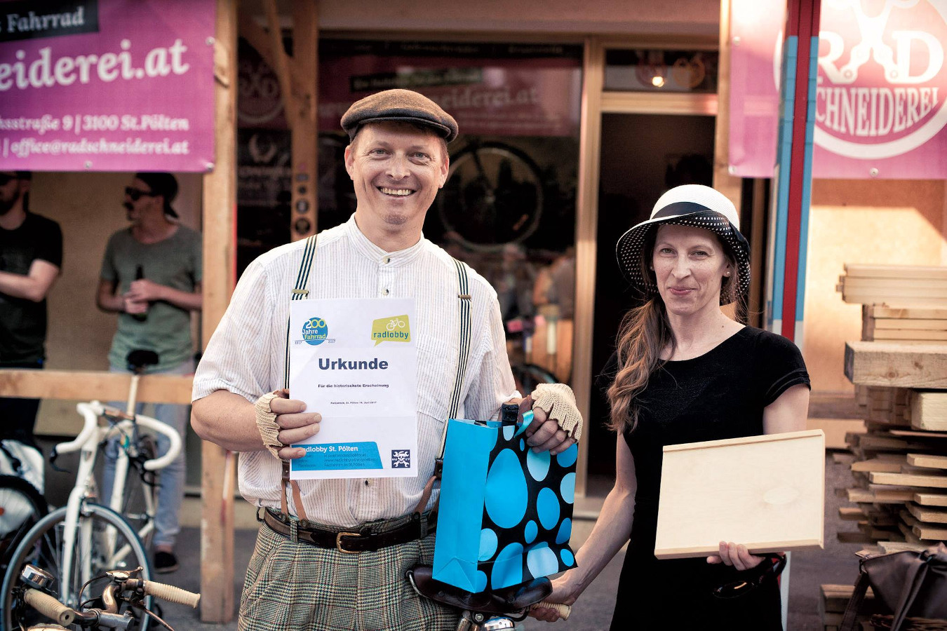 In der Alten Reichsstraße bei der Radschneiderei gab es einen Zwischenstopp. Hier wurde die historischste Erscheinung prämiert. Herr Johannes Graf überzeugte die Jury bestehend aus dem Mitradlerinnen und Mitradlern mit französischem Tandemrad mit klassischem Picknickkorb und die passende Tweedlook-Kleidung.