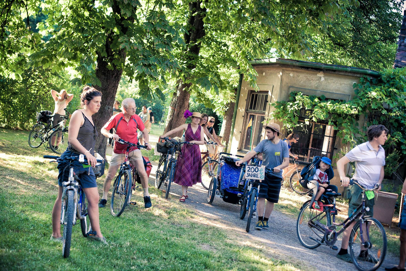 Unter Anleitung der Radlselbsthilfewerkstatt wurde im Sonnenpark eine Draisine gebastelt. Es gab verschiedenste Funbikes zum Ausprobieren und einen Velogolf-Bewerb. Bei optimalen Wetterbedingungen wurde unter Bäumen gepicknickt und velosophiert.