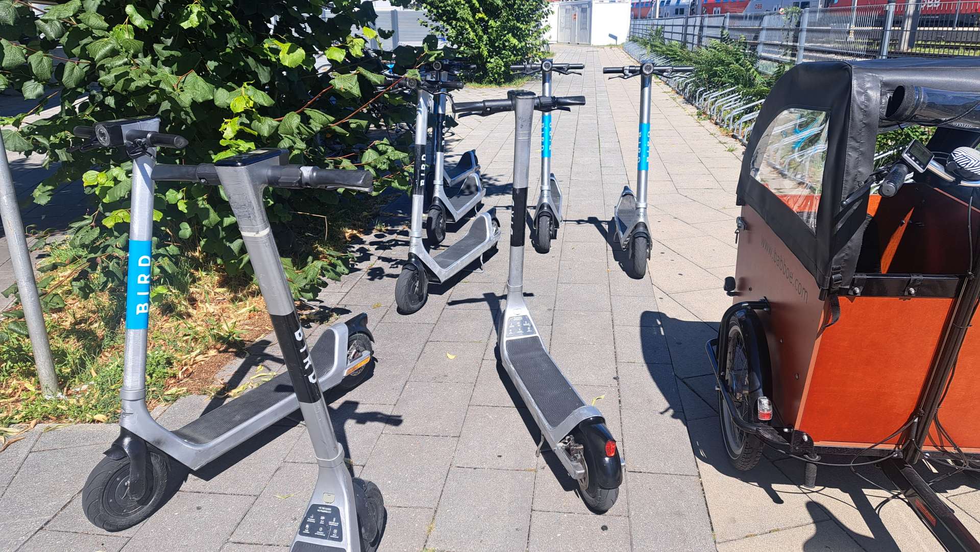 Was tun, wenn E-Scooter der Firma BIRD auf dem Geh- oder Radweg stehen oder sonst hinderlich abgestellt sind wie am linken Foto (Bahnhof Westseite)?